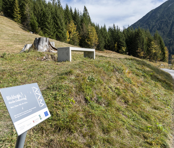 Die „Blickbank“ fügt sich als reduzierter Eingriff in die Naturlandschaft ein und schafft Raum für Reflexion. Das Edelweiß, eine ursprünglich aus Zentralasien stammende Pflanze, wirkt in diesem Kontext fremd und vieldeutig. Es wird zum Symbol der Entfremdung – etwas Unwirkliches inmitten der scheinbaren Idylle.