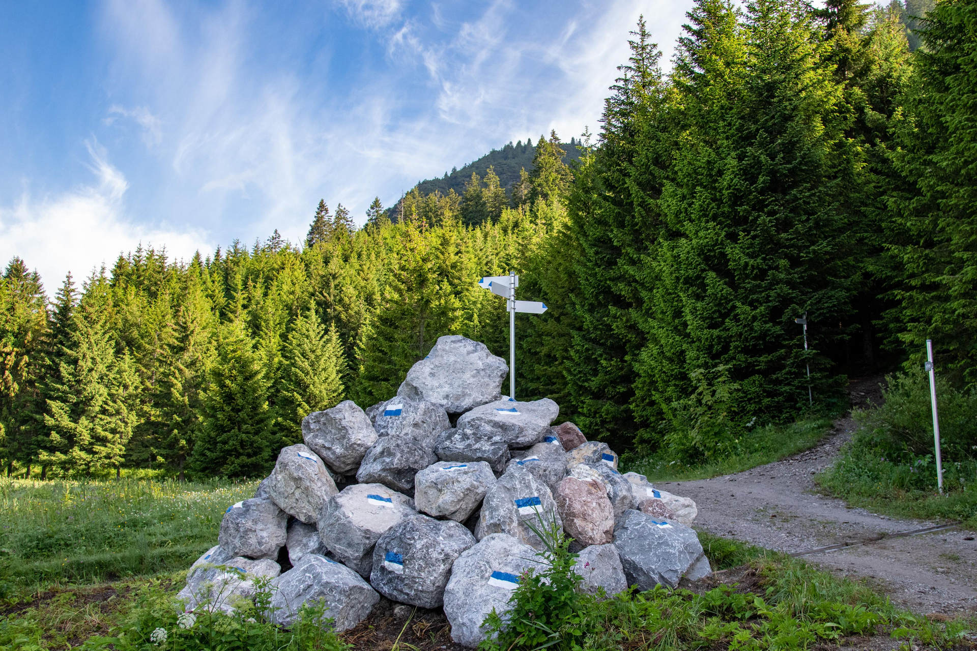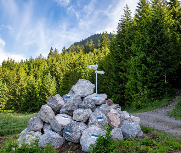 Das Kunstwerk „Komprimierter Weg“ verdichtet alle Markierungen eines fiktiven Wanderwegs zu einem sinnlosen Haufen und hinterfragt Orientierungssysteme, sowie unsere scheinbare Selbstbestimmtheit in der Natur.