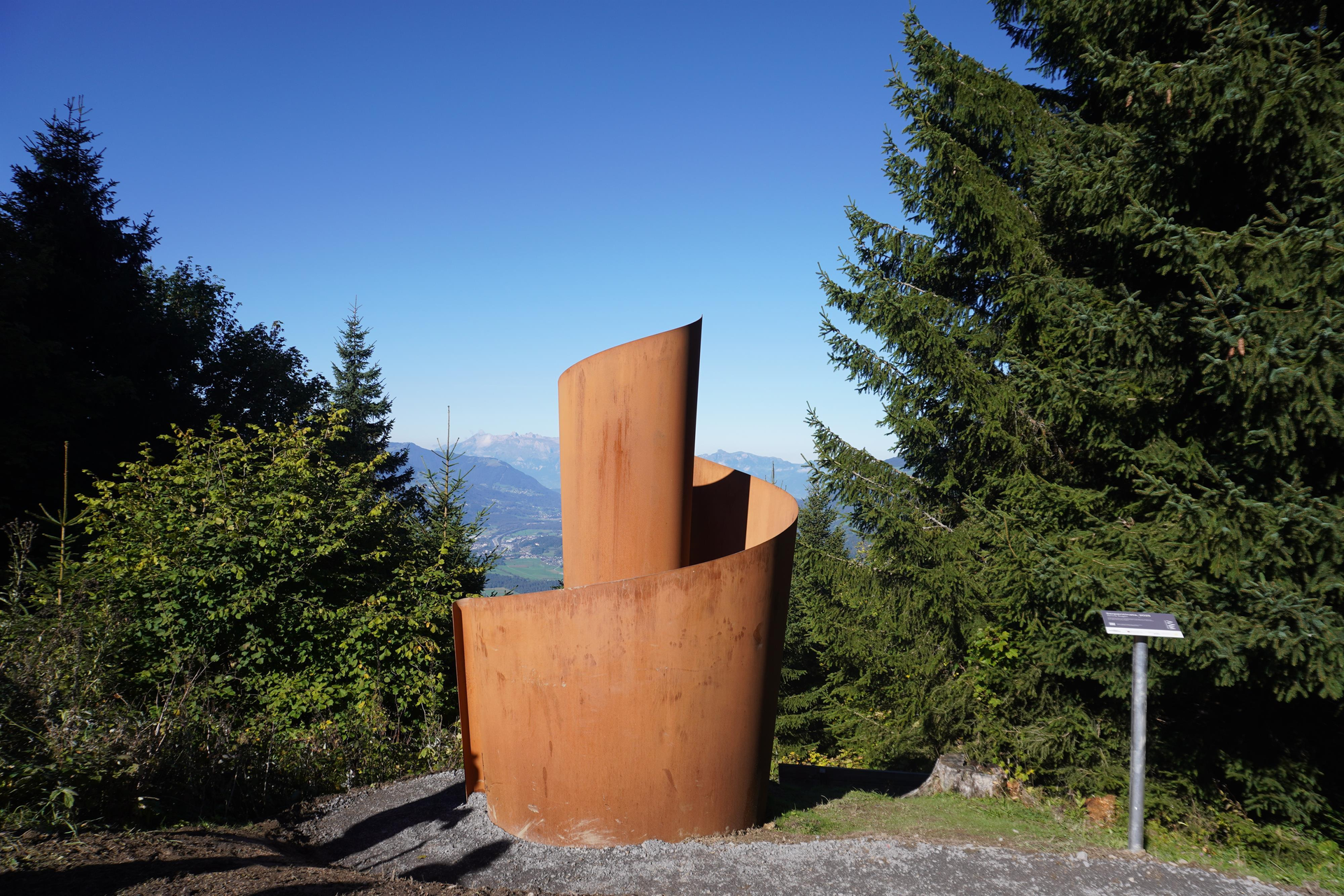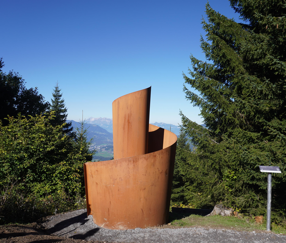 Die „Serpentinata“ ist eine spiralförmige Wand, die den Weg nach innen symbolisiert. Der Pfad verläuft entgegen dem Uhrzeigersinn mit einem schmalen Schlitz, der den Blick auf den Walgau freigibt. Die gewundenen Wände dämpfen den Schall und schaffen einen Raum der Stille in der Natur mit fokussiertem Ausblick.