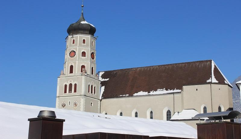 Der Glockenturm wurde 1667 bis 1670 nach den Plänen des Feldkircher Jesuitenpaters Maximilian von Lerchenfeld errichtet. Über dem viereckigen Grundturm, der oben an den Ecken vier Evangelienbüsten trägt, folgt ein dreigeschossiger Achteckturm mit Rundbogenöffnungen und Zwiebelhaube. Das Geläute besteht aus fünf Glocken, wovon zwei so wertvoll sind, dass sie in beiden Weltkriegen nicht eingeschmolzen wurden.