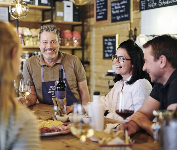 Das Herzstück der Spezerei ist ein langer Tisch, an dem sich Geschichten und Menschen begegnen. "An diesem Tisch wird geteilt – Erlebnisse, Geschichten, Brettljausen, Weinflaschen. Das macht unser Dorfleben einzigartig.“, so Hannes. Er erzählt von Einheimischen und Gästen, die hier eine lebendige Gemeinschaft erleben – alle an einem Tisch. Im Gespräch wird schnell klar: Hannes ist mehr als ein Gastgeber. Er versteht sich als Brückenbauer zwischen Althergebrachtem und dem neuen Zeitgeist, als jemand, der Menschen und Kulturen über gewohnte Grenzen hinweg vereint.