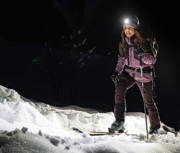 Aber zurück zum Aufstieg! Grundsätzlich unterscheidet sich eine nächtliche Skitour kaum von einer bei Tageslicht – abgesehen von der besonderen Atmosphäre der Nacht. Heute haben wir doppeltes Glück: Über uns funkelt nicht nur ein klarer Sternenhimmel, sondern der fast volle Mond schenkt uns sein Licht. Manchmal schalten wir sogar unsere Stirnlampen aus, nur um einen Moment lang in die winterliche Stille einzutauchen und den Lichtverschmutzern ein Schnippchen zu schlagen. Aber nicht zu lange – schließlich wollen wir für andere Nachtschwärmer gut sichtbar bleiben!