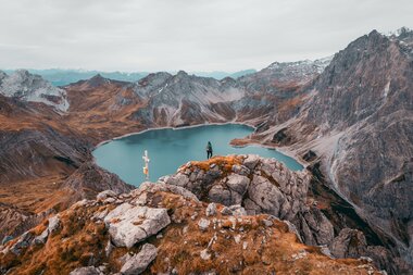 Nach einer weiteren Übernachtung in der Douglass Hütte brechen wir am nächsten Tag zu unserem letzten Blickwinkel auf. Wer auf die Gamsluggen möchte, der muss früh aufstehen, denn der Weg ist anspruchsvoll. Ein gut gesicherter, aber anstrengender Steig liegt vor uns. Es weht ein leichter Wind, der See wirkt milchig aber immer noch türkis. Oben angekommen, bietet sich ein bezaubernder Anblick. Vor uns liegt das türkise Herz des Rätikongebirges! Die einmalige Herzform bietet sich ausschließlich aus dieser Perspektive und entlohnt den anstrengenden Aufstieg zur Gamsluggen allemal.