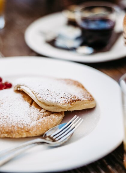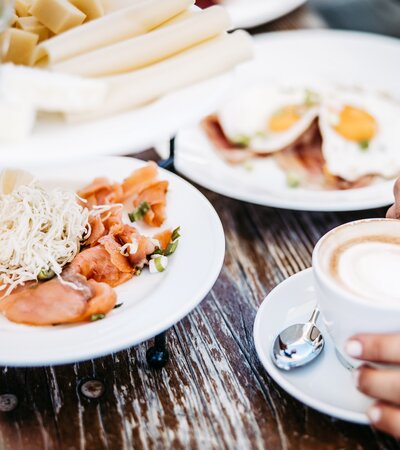 Bergfrühstück mit reicher Brotauswahl, der besten Käseauswahl der Genussregion Vorarlberg, geräuchertem Fisch, Obst und Gemüse, Honig- und Marmeladenauswahl, vegetarischen Aufstrichen, Müsli - und Ländle-Joghurt, Rühreier mit frischem Schnittlauch und natürlich Vorarlberger Riebel und den legendären Topfenknödeln.