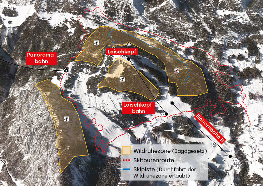Gezielte Lenkung von Skitourengeher:innen durch ausgewiesene Aufstiegsrouten und Abfahrten über bestehende Skirouten und Pisten sollen die Störungen verringern und die Qualität der Ruhezone verbessern.