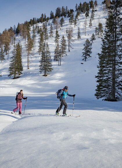 In Ruhe den Berg besteigen und dabei die Stille der Winterlandschaft genießen, dann über traumhafte Tiefschneehänge abschwingen. In der Alpenregion Vorarlberg gibt es zahlreiche Möglichkeiten für unvergessliche Skitouren. Die Anstrengungen des Aufstiegs werden mit einer fantastischen Aussicht auf das Bergpanorama und dem berauschenden Glücksgefühl der Abfahrt belohnt. Ein absolutes Highlight ist sicher die anspruchsvolle Tour für erfahrene Sportler und Sportlerinnen auf den höchsten Gipfel des Rätikons, die Schesaplana mit über 2900 Meter Höhe. Doch Du musst nicht gleich so hoch hinaus für grandiose Outdoor-Erlebnisse. Es gibt zahlreiche weitere Strecken für jedes Konditions-Level.
