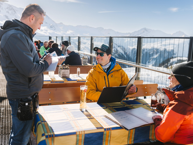 Atemberaubend die Aussicht – excellent die Küche! Genieße die Spezialitäten auf höchstem Niveau, begleitet von hervorragenden Weinen. Bei schönem Wetter bedienen wir Dich auch auf der einladenden Sonnenterrasse - ein doppelter Genuss. Das Restaurant ist auch zu Fuß erreichbar und zwar auf dem Winterwanderweg zum Muttjöchle.