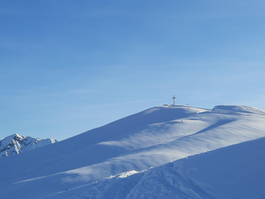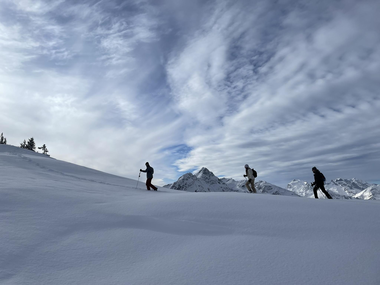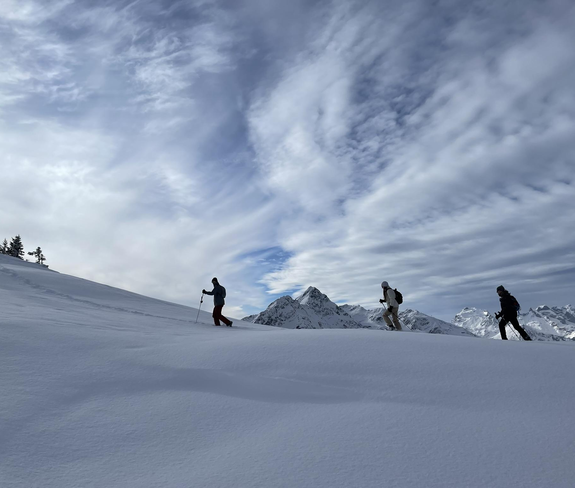 Mit Schneeschuhen auf das Muttjöchle: Vom Muttjöchle aus erwartet Dich eine weite Fernsicht ins Klostertal, zum Arlberg und zum Rätikon. Auf Wunsch kannst Du nach der Wanderung im Panoramarestaurant Muttjöchle einkehren.