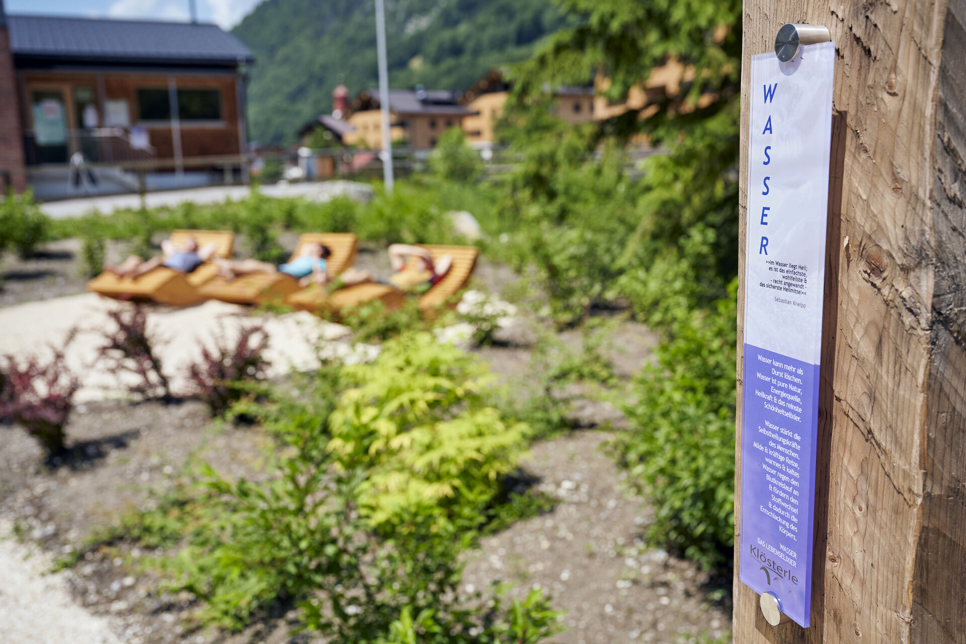Aber auch nach einer ausgedehnten Wanderung im Klostertal lassen sich auf diese Weise müde Muskeln wieder aktivieren. Der Kneipp und Relax Garten Alfenz in Klösterle ist  eine Oase der Entspannung und Erholung inmitten einer Vielzahl blühender Kräuter, Büsche und Blumen – insgesamt sind es über 2000 Pflanzen. „Wir haben Wert darauf gelegt, Insekten Nahrung und Lebensraum zu bieten und den Garten so naturnah wie möglich zu gestalten“, berichtet Cornelia. Und so schaukeln und brummen eine Vielzahl von Schmetterlingen, Bienen und Hummeln von Blüte zu Blüte. Wer die Atmosphäre noch etwas länger genießen möchte, der kann sich auf eine der Ruheliegen zurückziehen. Vielleicht möchte man dabei in einem Buch schmökern, vielleicht möchte man aber auch einfach den einmaligen Ausblick auf die Bergwelt des Klostertals genießen und dabei die Seele baumeln lassen. Wer noch tiefer ins Element Wasser eintauchen möchte, der braucht nur durch den Garten zu wandern und die Straßenseite zu wechseln. Dort befindet sich nämlich der Almwasserpark Klösterle, ein kleines Badeparadies mit Natursee, Kinderbecken und Beachvolleyballfeld.