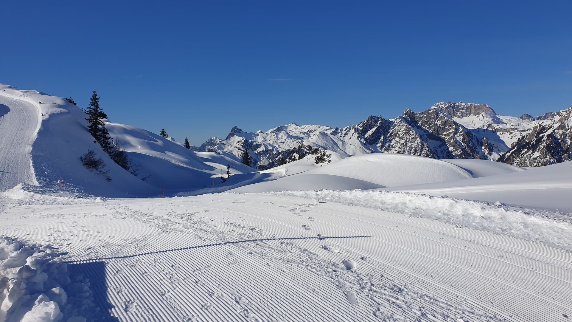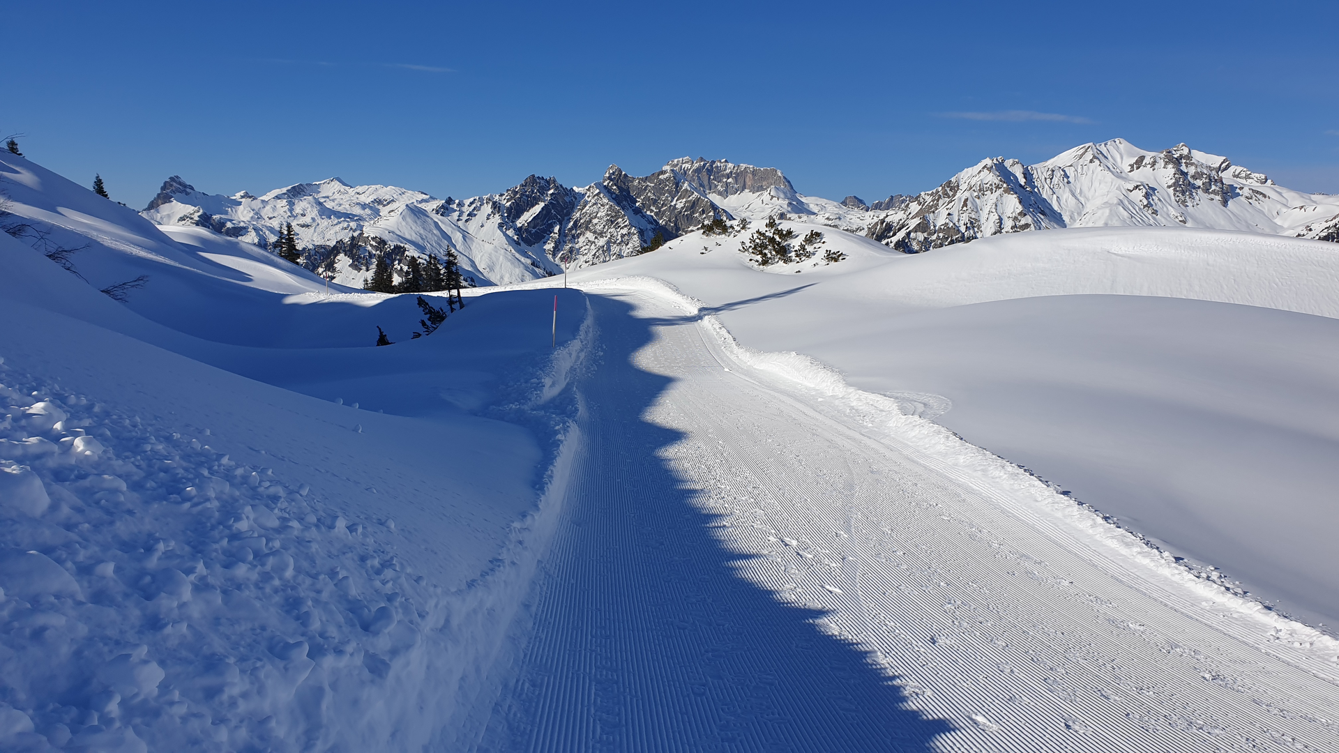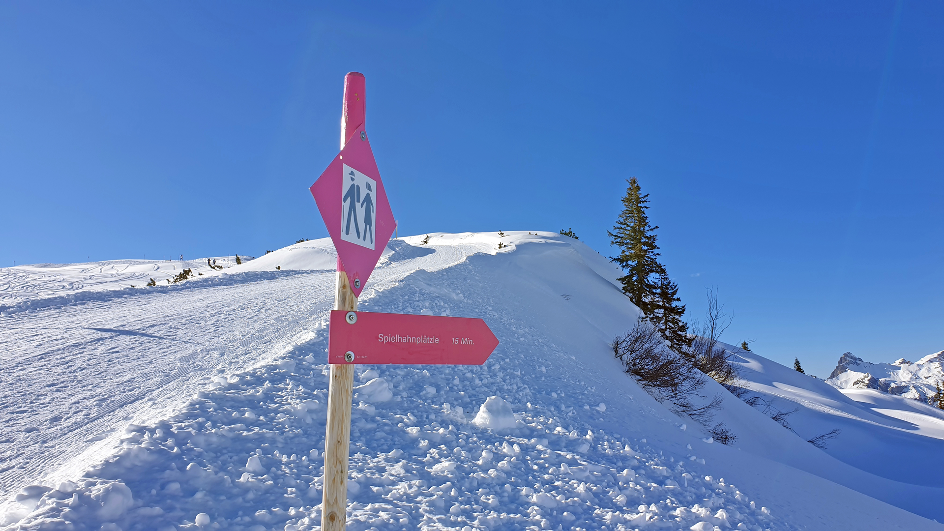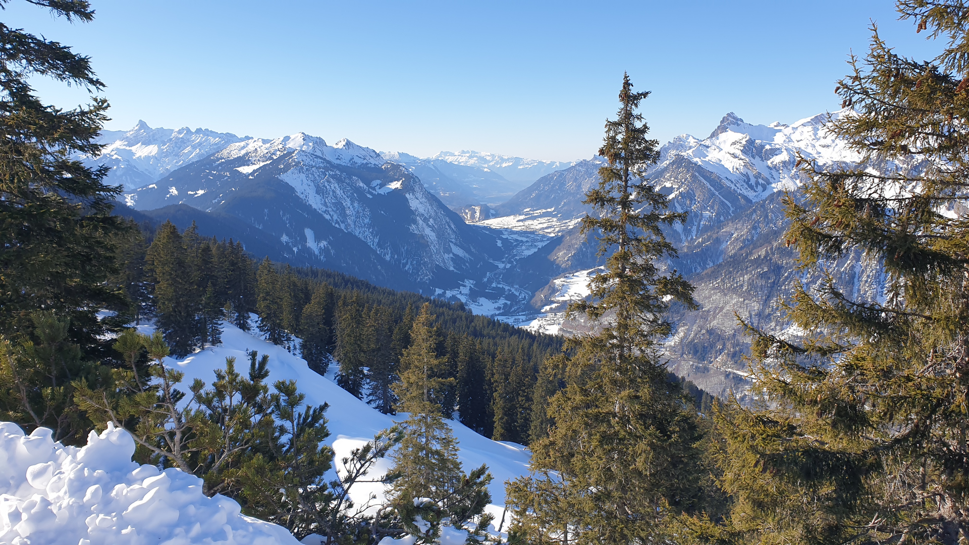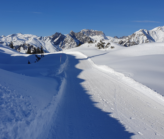 Der Winterwanderweg führt vorbei am Riedbodenlift zum Aussichtspunkt „Spielhahnplätzle“. Genieße von hier die herrliche Aussicht übers Klostertal bis zu den Schweizer Bergen.