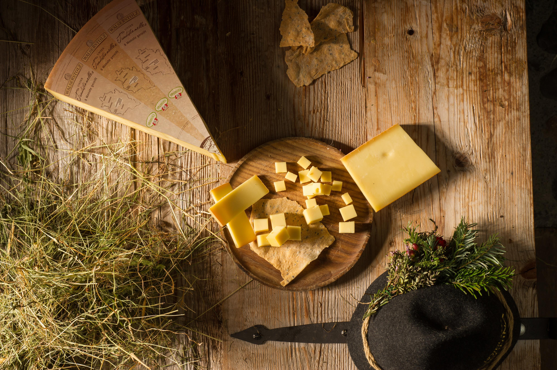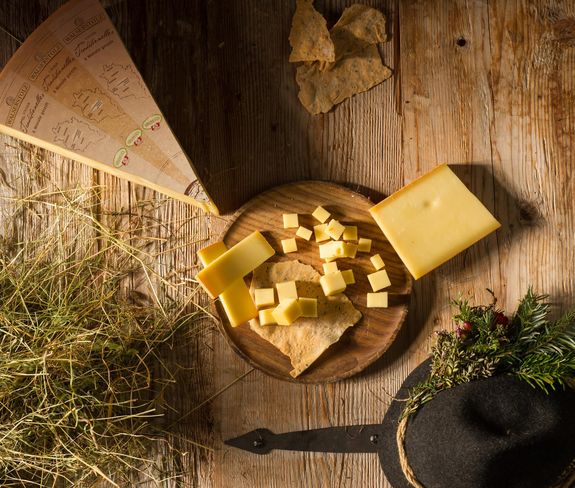 Erlebnissennen mit einem erfahrenen Senn, g‘sottne Grompara (Pellkartoffeln) mit Käse, Butter und Aufstrichen, selbst gesennter Käse von ca. 8 bis 9 kg nach 3 Monaten Reifezeit.