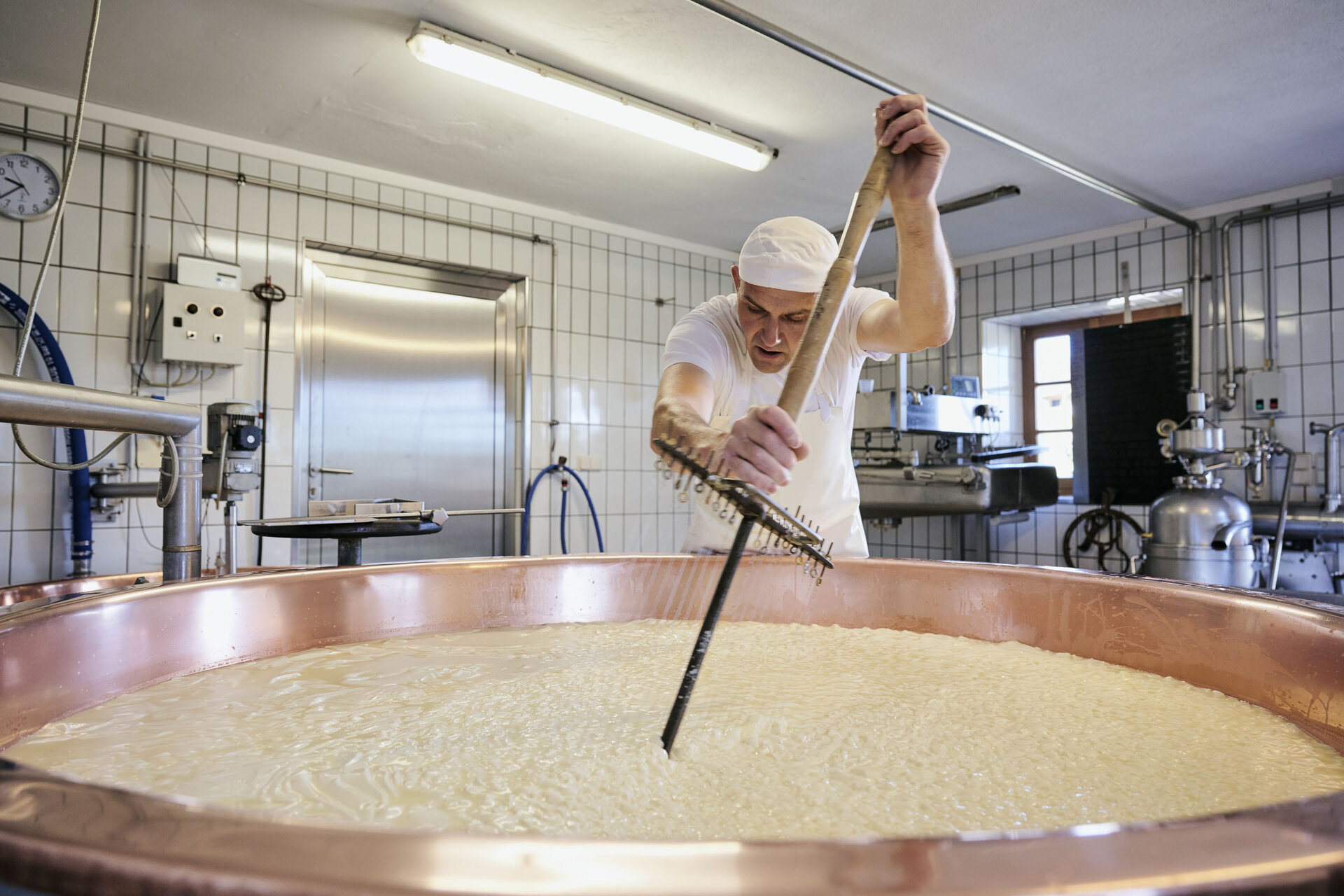 Der Tag auf einer Sennalpe, wie hier auf der Alpe Steris, beginnt früh morgens und noch bevor der erste Hahn kräht. Die Kühe sind bereits wach, und so führt der erste Gang in den Stall zur morgendlichen Melkrunde. Frische Alpmilch fließt alsbald direkt in den Kessel der Sennerei, wo der Senn oder die Sennerin die Milch zu Alpkäse, Alpbutter und anderen Milchprodukten verarbeitet. Ein Stück Handwerkskunst, das hier oben mit viel Hingabe und nach alter Tradition ausgeübt wird.